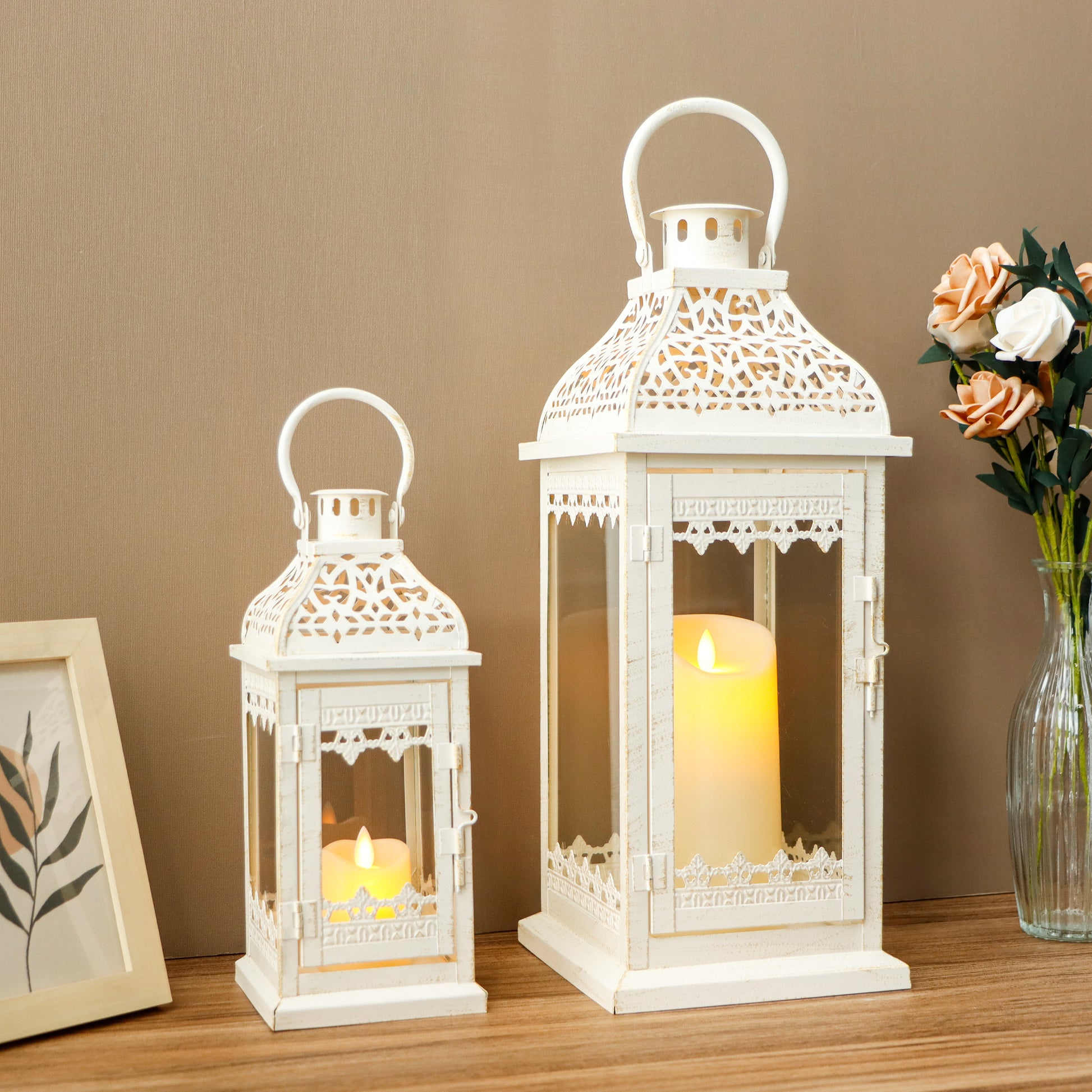 【UNIVERSAL SIZE FOR MOST OCCASION】- Uses tea-light, votive or small pillar candles(candles are not included) up to 3" x 4" & 4” x 6”. 4.5 " x 4.5" x 13"tall, 7" x 7" x 19.5"tall.Iron and glass. Small lantern is packed inside the large lantern.