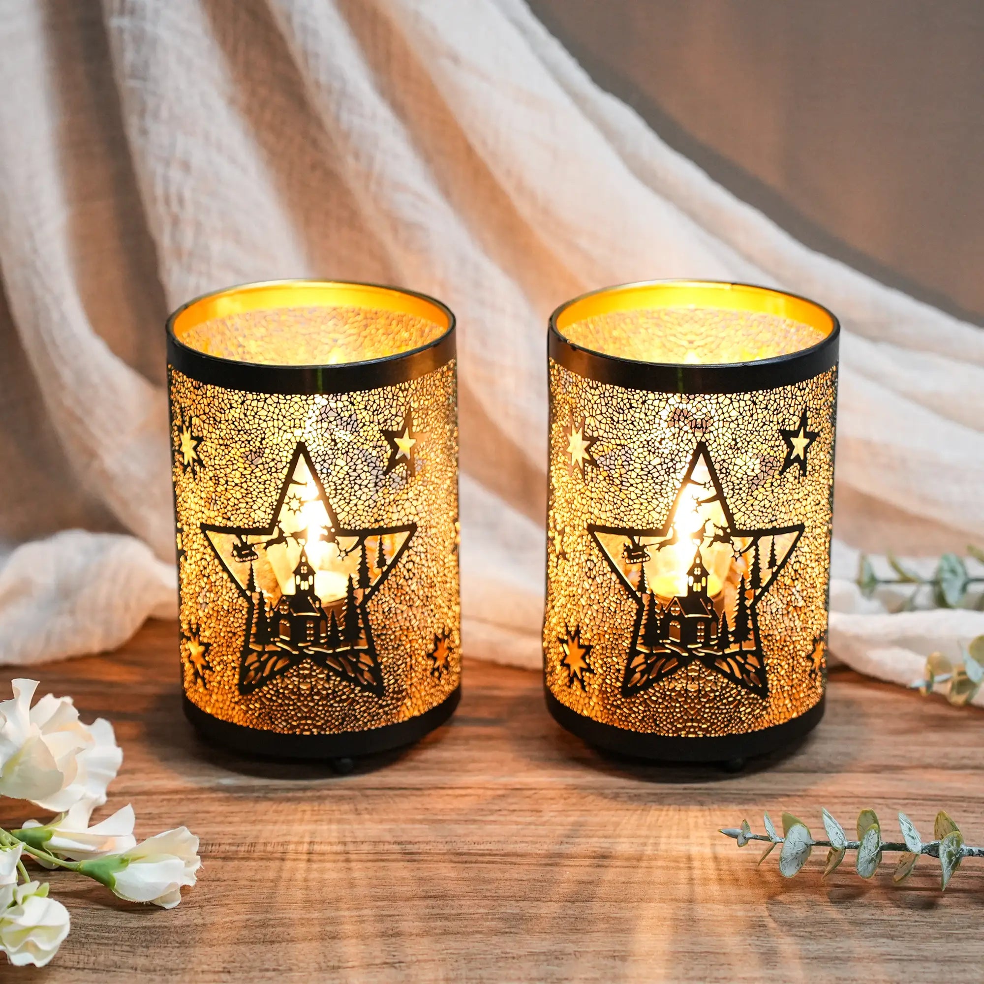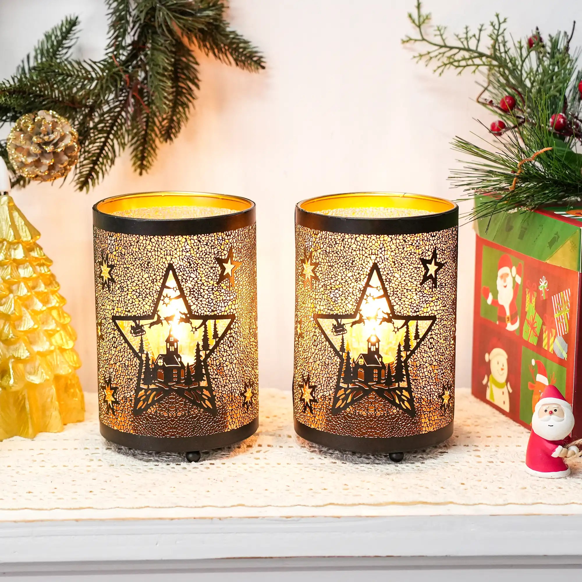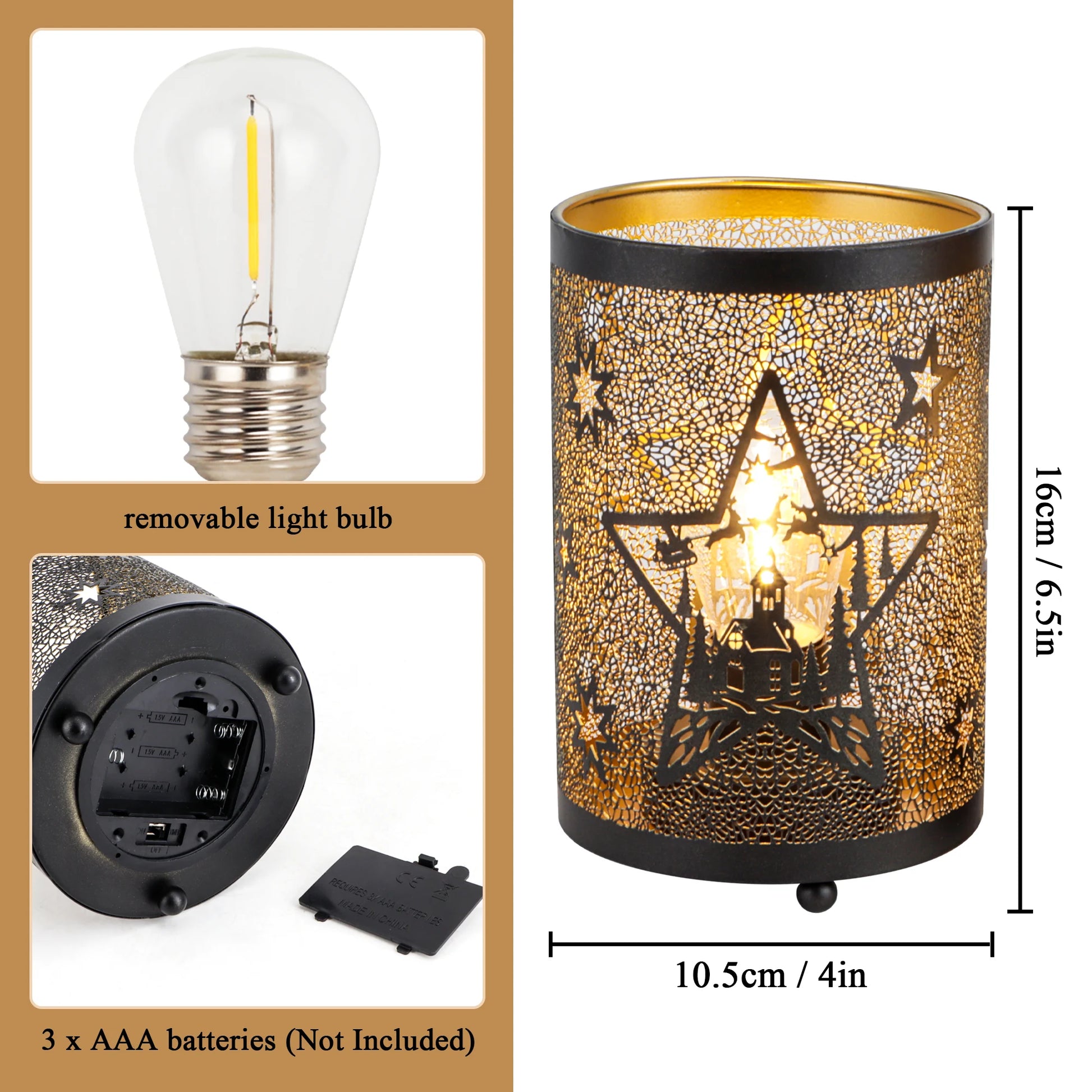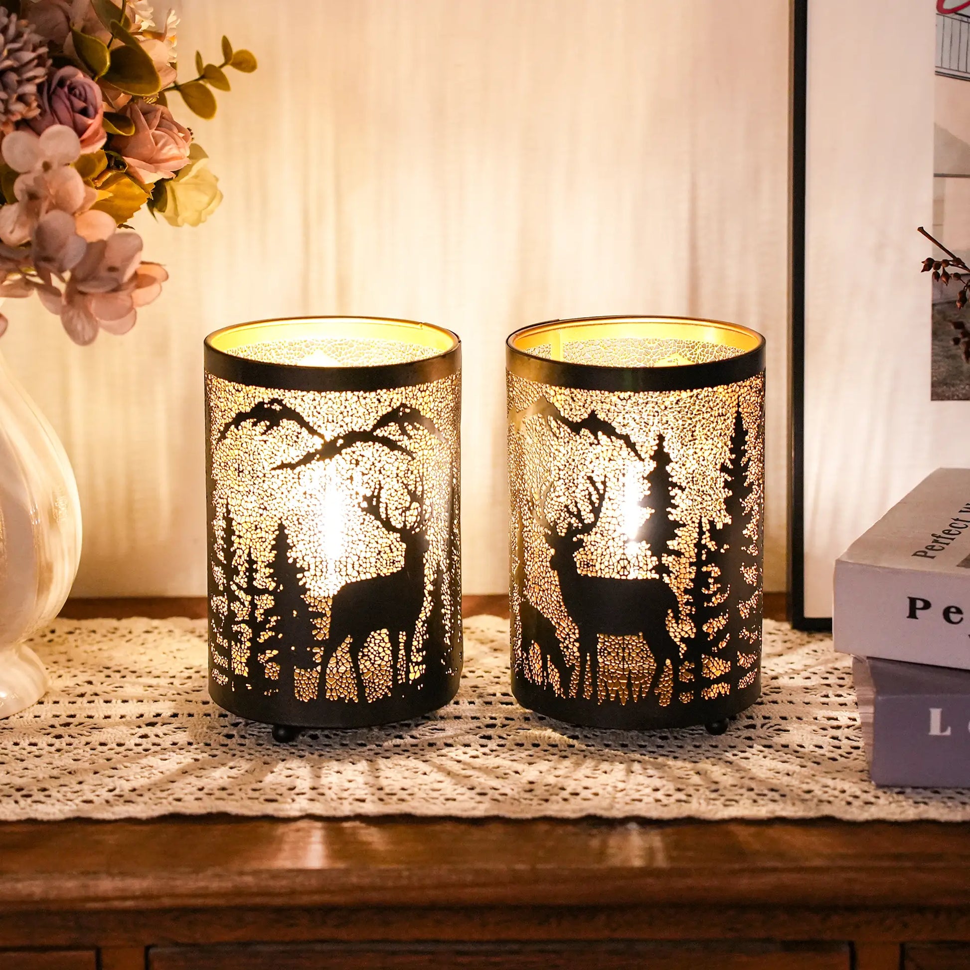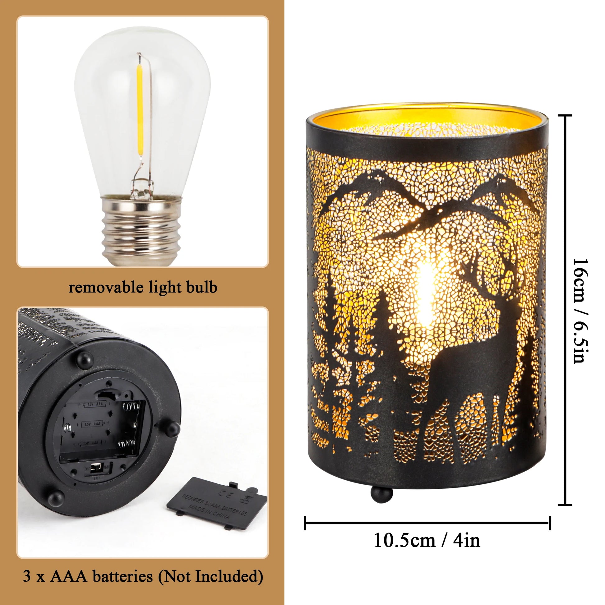 🦌【Christmas Decorative Lamp】: This set of Christmas lamps is crafted from high-quality wrought iron and features an Etched design featuring classic holiday elements like deer, pine trees, and mountain silhouettes. When lit, they cast captivating light patterns, instantly infusing any space with a warm, magical Christmas atmosphere and complementing your holiday decor.