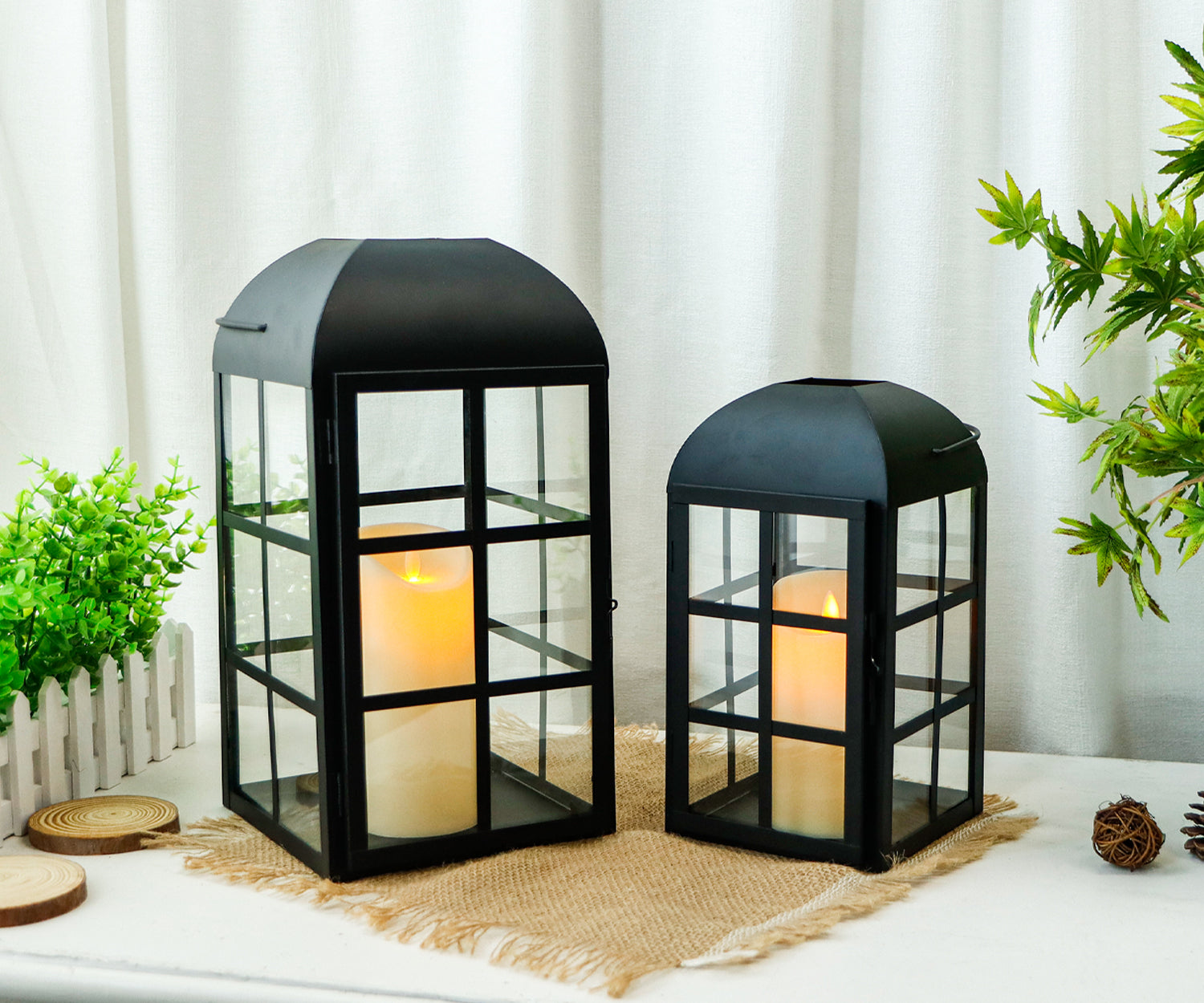 【GREAT DETAILING】The large size is 7'' x 7.5'' x 14'', small size is 5.5'' x 6'' x 10.5''. The lantern is made of metal and four pieces of tempered glass, which is stronger than ordinary materials. The top of the product has a hollow design, and there is a vent above the candlestick, which can circulate the air in the candlestick, and the small door on the side can be easily opened and closed.