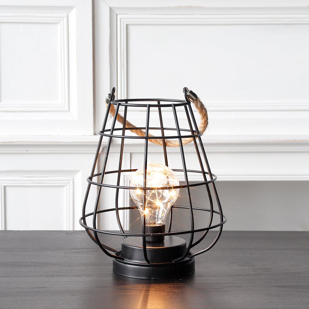 JHY DESIGN 8.5"H Cage Lantern: Decorative Table Lamp, Battery-Powered, Cordless, Warm White Fairy Lights + LED Edison Bulb (Black)