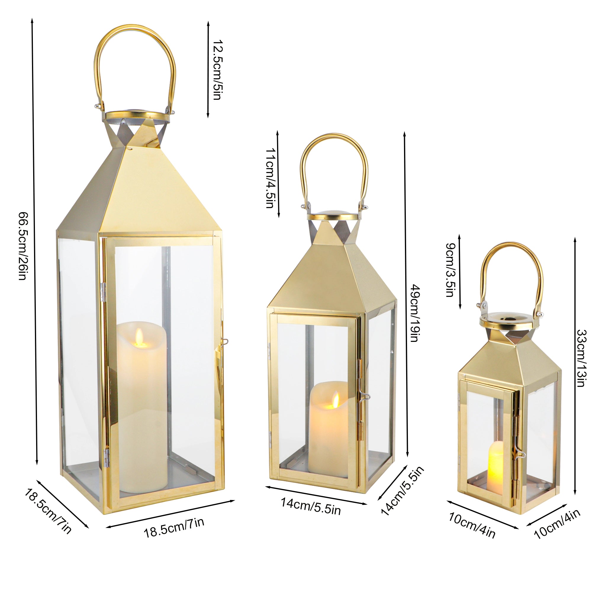 š”ćGREAT DETAILINGćFeatures three sizesļ¼26'';19'';13''H). The lantern is made of painted iron and four pieces of tempered glass, which is stronger than ordinary materials. The top of the product has a hollow design, and there is a vent above the candlestick, which can circulate the air in the candlestick, and the small door on the side can be easily opened and closed.