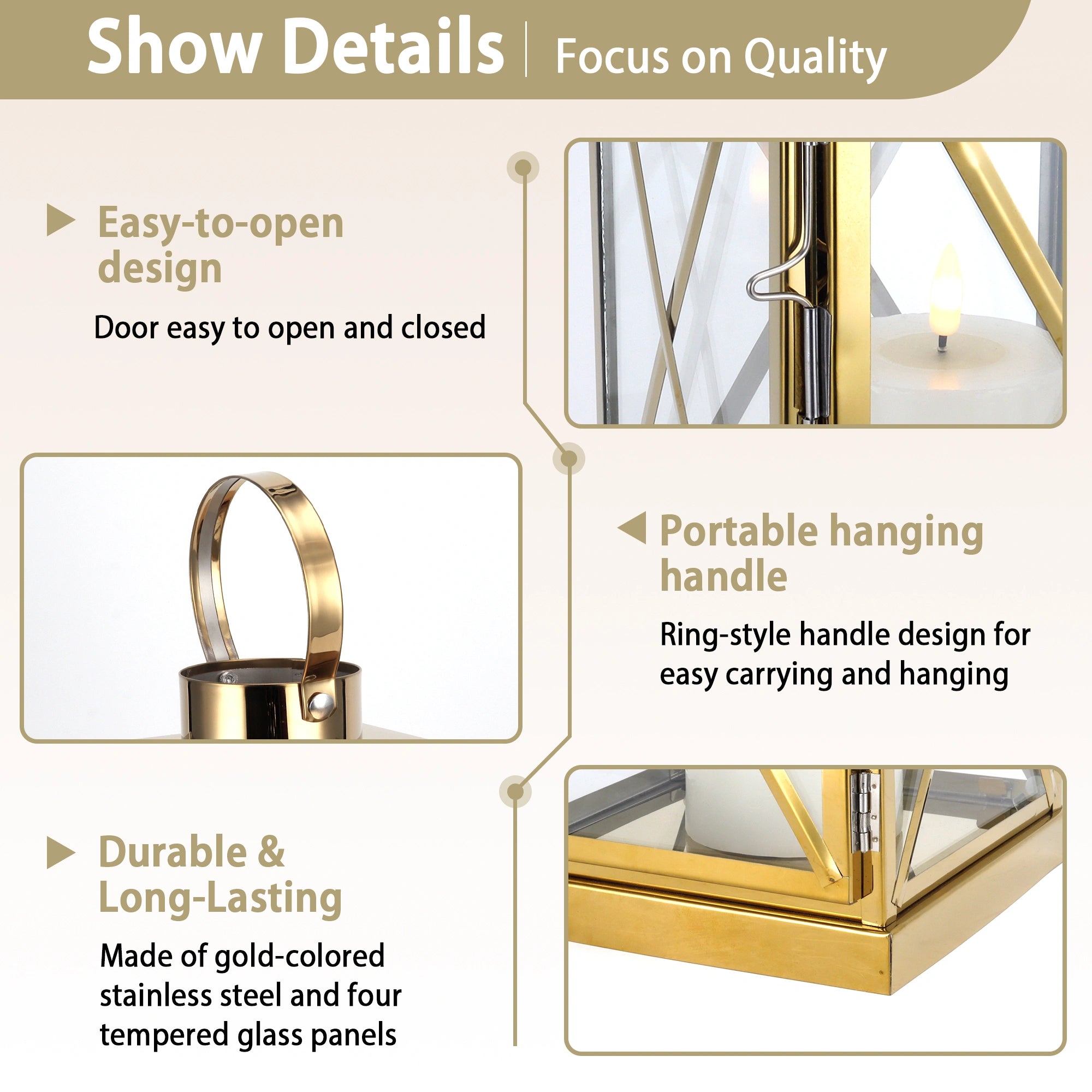 VERSATILE DESIGN - The TRIROCKS Golden Stainless Steel Lantern Set of 3 offers adaptable decor solutions. With sizes small (5" x 5" x 9"), medium (6" x 6" x 12"), and large (8" x 8" x 16"), these lanterns can be displayed on any surface or hung using the decorative ring. The sleek golden finish and cross stainless steel bars not only add a touch of class but also reinforce their design, making them ideal for an array of candles (not included)
