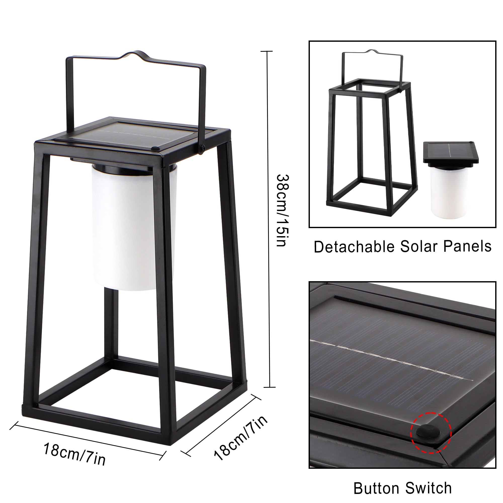 PORTABLE LED OUTDOOR LANTERN: The cordless outdoor solar lantern is crafted from durable metal and PS materials. Its compact, lightweight design ensures easy portability, while the sturdy handle allows for convenient hanging. Dimensions: 7" (L) × 7" (W) × 15" (H). The top solar panel is detachable, enabling independent charging under direct sunlight.