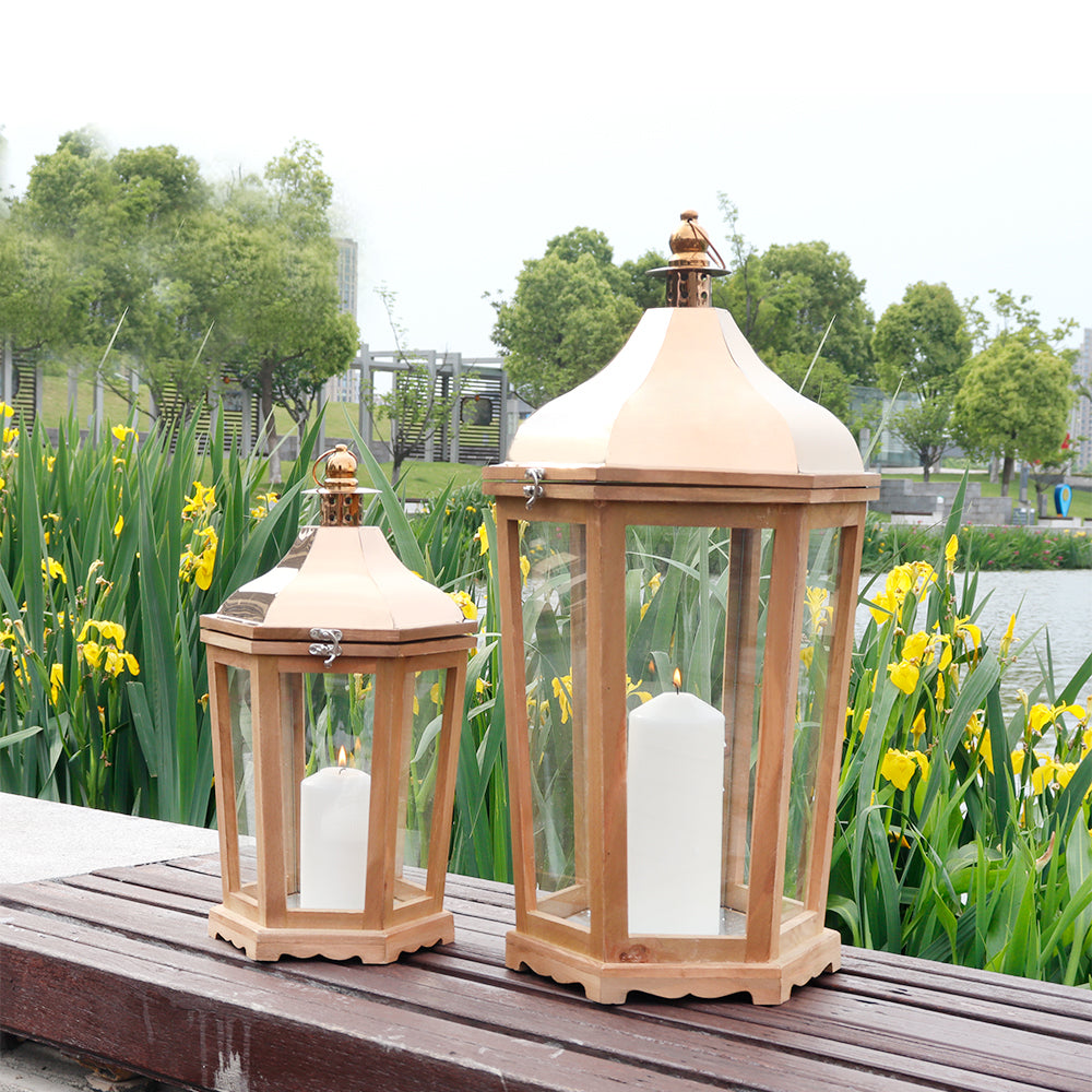 Fashioned from authentic wood and metal, these lanterns epitomize durability paired with aesthetics. Their sturdiness, backed by a combined weight that speaks of quality, ensures they remain timeless pieces in any collection.