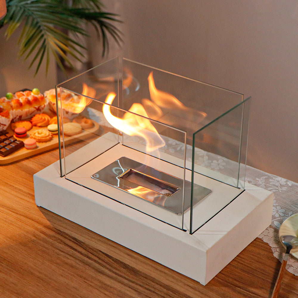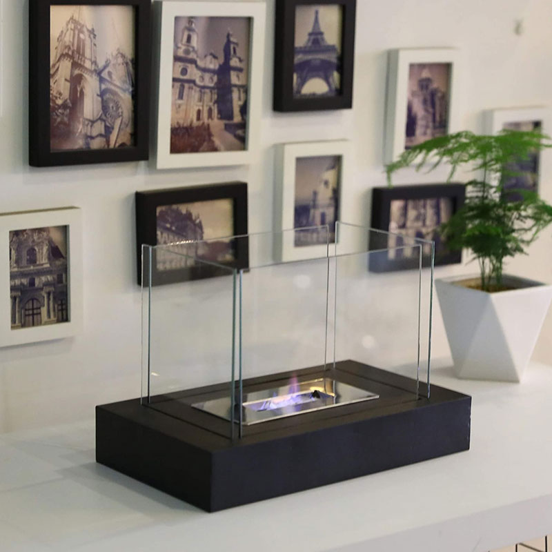 Das schlanke und geformte rechteckige Design dieses Tischkamins , umgeben von transparentem Glas, geht über die bloße Funktionalität hinaus; Es ist eine ästhetische Aussage. Seine einzigartige Form, die an moderne Kunst erinnert, verbindet das Nützliche mit der Avantgarde und verleiht jedem Raum, ob drinnen oder draußen, ein faszinierendes zeitgenössisches Flair.