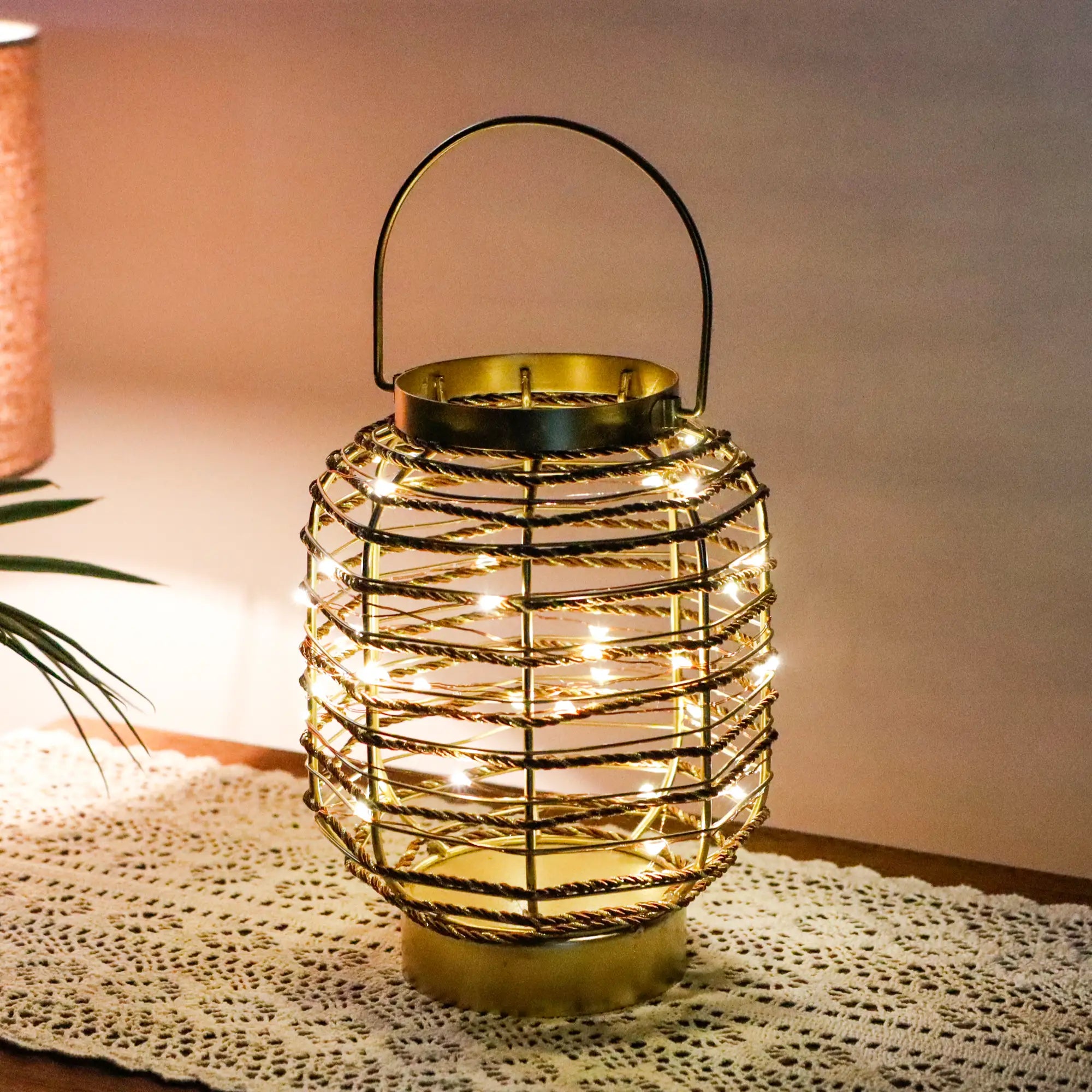 - Dekorative kabellose Metalllampe: Diese dekorative Lampe hat eine klassische Laternenform mit einem luxuriösen Roségold-Finish und verleiht einen Hauch moderner Eleganz und Raffinesse. Umhüllt von zarten Lichterketten schafft sie eine warme und einladende Atmosphäre. Das schlichte und doch schicke Design macht sie zu einer perfekten Ergänzung für jede Inneneinrichtung.
