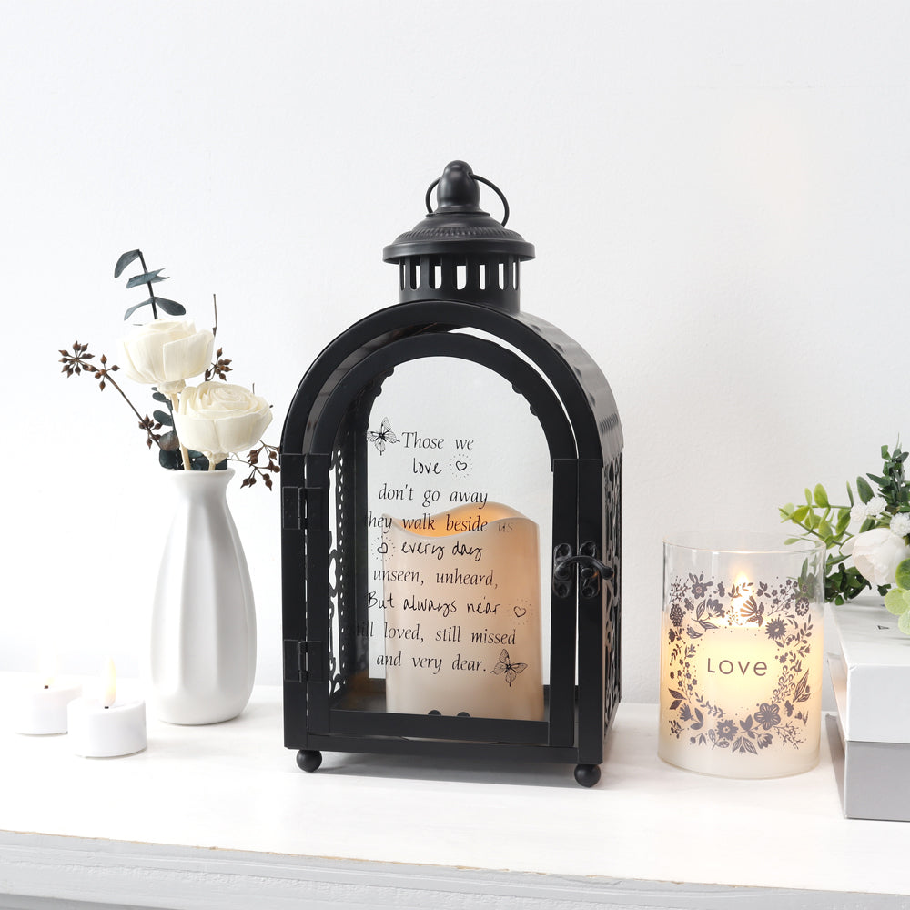 Ces lanternes contiennent la flamme éternelle métaphorique, une lumière de mémoire qui ne s'éteint jamais. Ils apportent chaleur et contemplation à n’importe quel espace, qu’il soit intérieur ou extérieur, signifiant l’amour et le souvenir éternels.