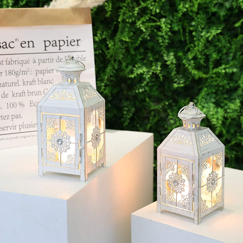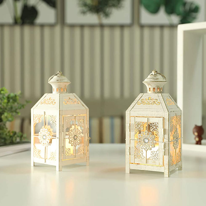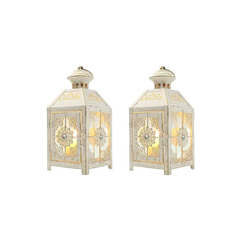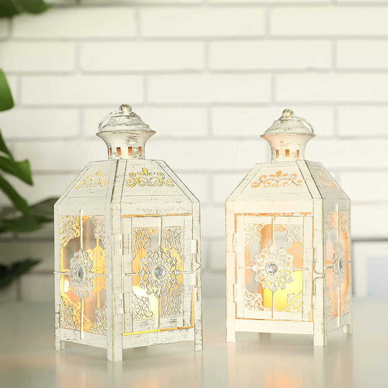 Set of 2 Decorative Lanterns 9.5" High Metal Candle Lanterns Vintage Style Hanging Lantern White with Gold Brush